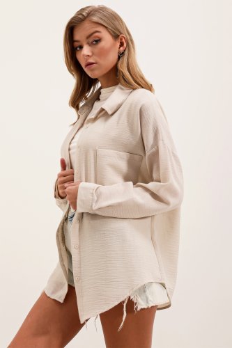 20153 Tek Cepli Oversize Keten Gömlek Krem